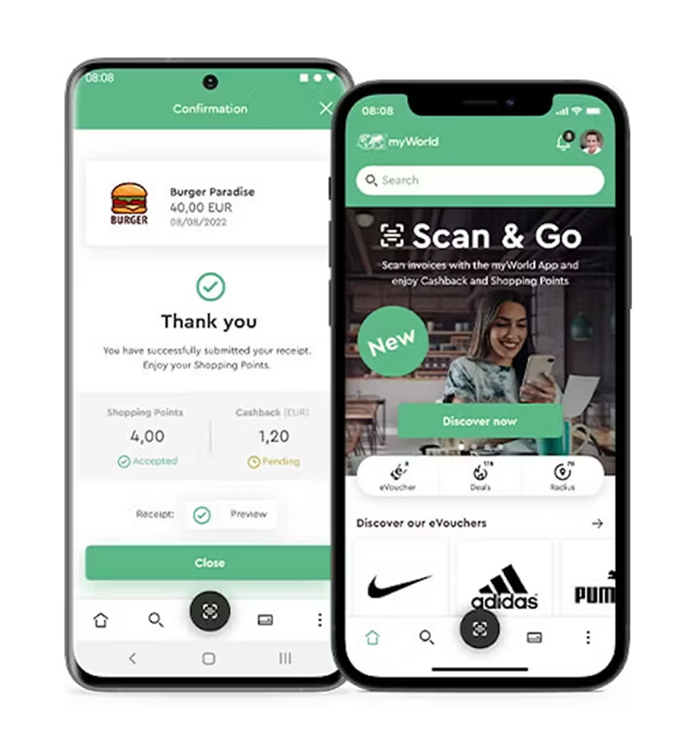 After paying, simply open the myWorld App, click on Scan & Go and scan your receipts directly within the myWorld App.